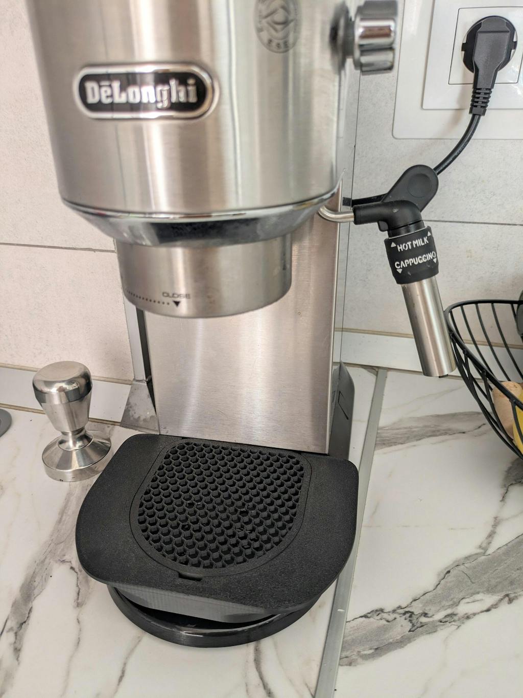 Verbreiterte flache Tropfschale für DeLonghi Dedica EC 685 und EC 885 Siebträgermaschinen. Schafft mehr Platz unter dem Siebträger, sodass zwei große Tassen inklusive Waage unter den Siebträger gestellt werden können.